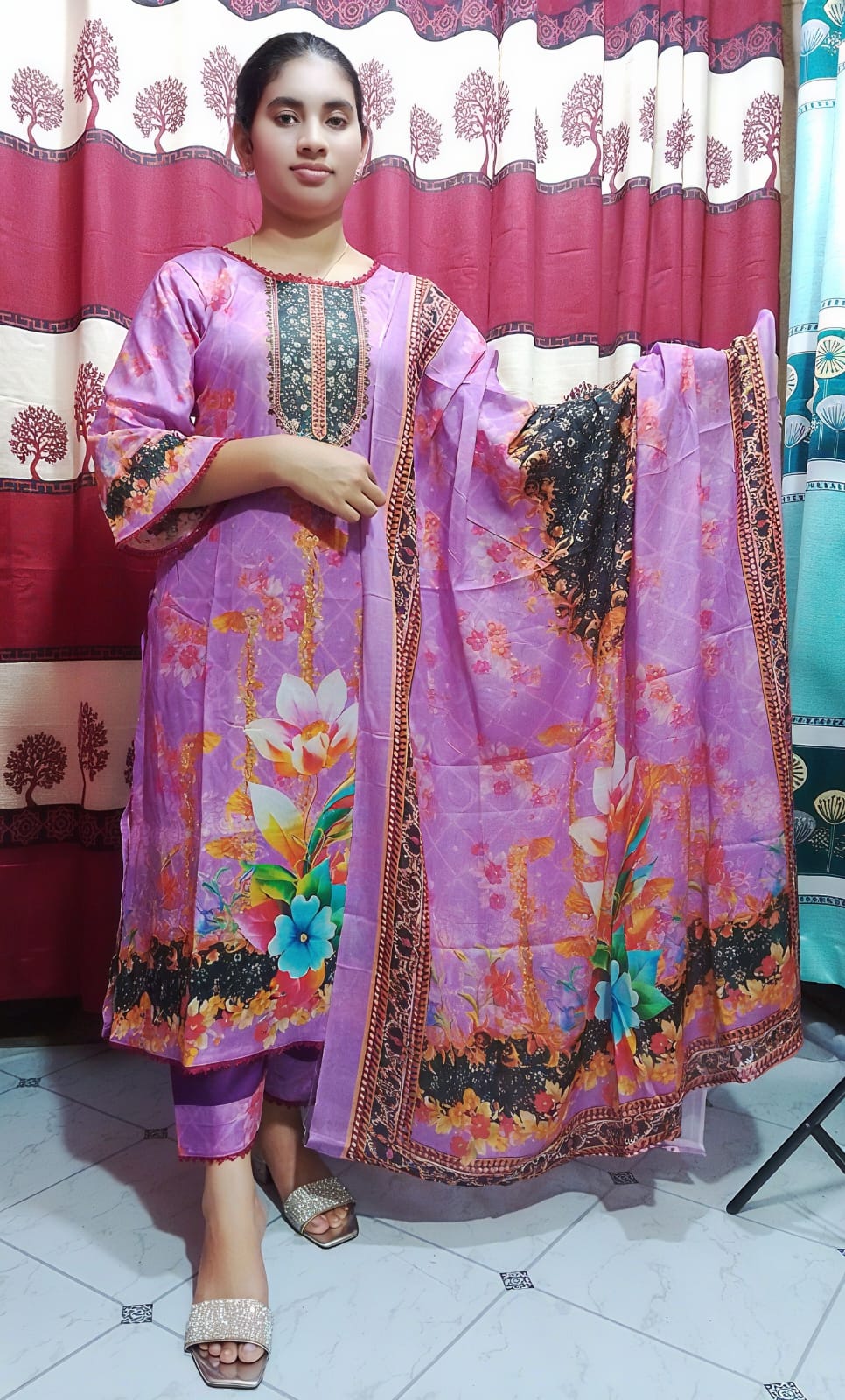 Orna : 100% cotton fabric, soft and digital print. 2.5 yard free size orna matching with kamij. Long 90 inches and width 40 inches.
